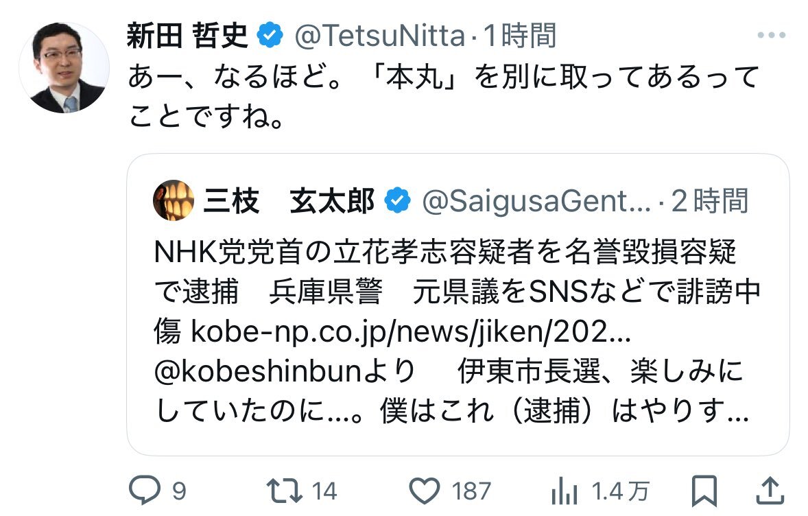 立花容疑者逮捕、NHK党がホームページに謝罪文 「X」にも同様の内容を投稿 kobe-np.co.jp/news/society/2… 今年1月に死去した元兵庫県議の竹内英明氏に対する名誉毀損の疑いで、政治団体「NHKから国民を守る党」党首の立花孝志容疑者(58)が県警に逮捕されたことを受け…
