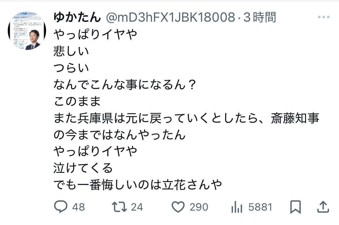 なんて言うか、生き方が汚いんよな。 姑息で、男らしくなくて、女々しくて、如何にも犯罪者って感じの生き方。 #兵庫県知事選挙2024 #反社会的カルト集団 #立花孝志逮捕 #サスケごめんなぁ x.com/yahoonewstopic…