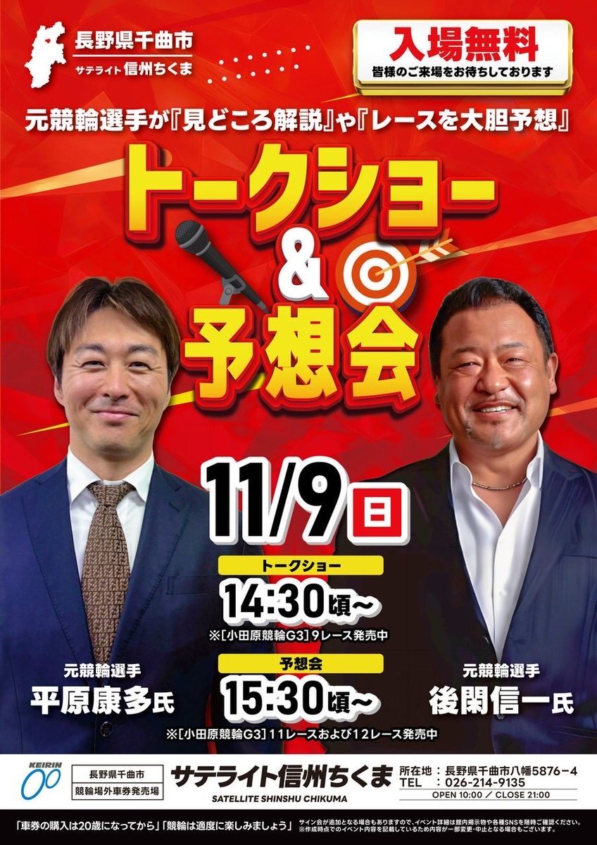 やってみようよケイリン❗️ #サテライト信州ちくま 11/9(日) #開催日程 G3→小田原競輪-最終日 #北条早雲杯争奪戦 決勝🔥 F1→富山競輪-2日目 F1→★玉野競輪-初日 F2→★💓別府競輪-最終日 ★=ナイター競輪 💓=ガールズ競輪 ご来場お待ちしております😊 pic.x.com/vtc4Iwg7jB