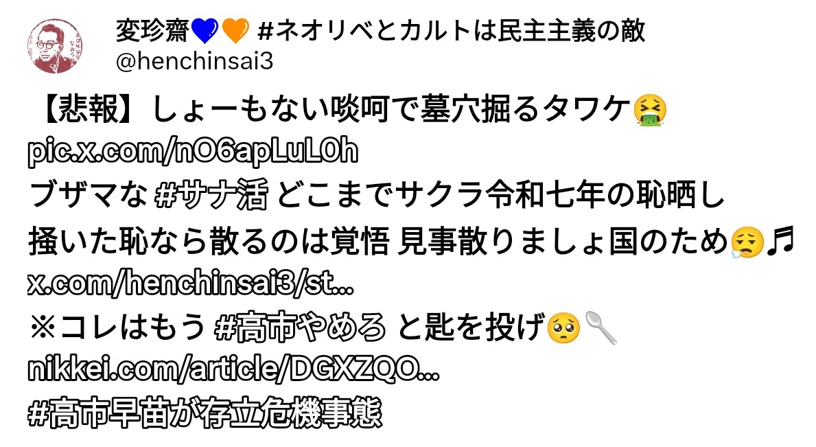 返信先:@takaichi_sanae#高市やめろ #高市早苗だけは絶対ダメ #高市早苗は総理の器に非ず #高市内閣の総辞職を求めます 米は高いまま、物価高騰対策は何もしません、給付金出しません、自動車税増税します、防衛費に税金使います、中国に謝罪しません #弱者切り捨て #サナエあればいのちなし #野党はもっと頑張れ