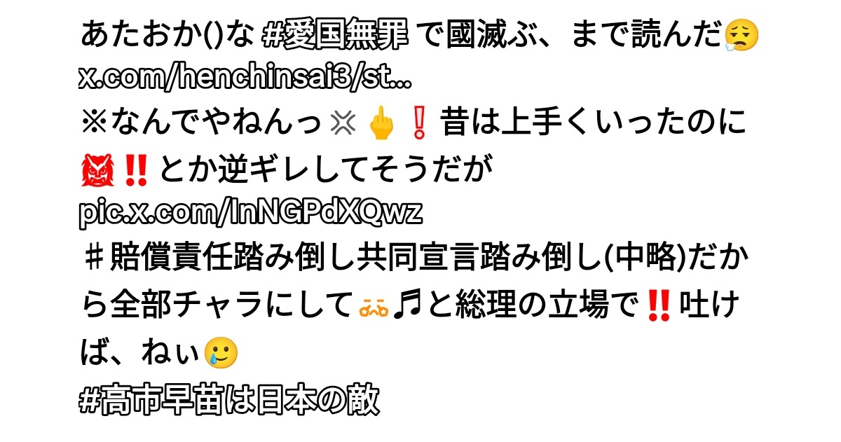 あたおか()な #愛国無罪 で國滅ぶ、まで読んだ😮💨 x.com/henchinsai3/st… ※なんでやねんっ💢🖕❕昔は上手くいったのに👹‼️とか逆ギレしてそうだが x.com/AnikaxWorld/st… ♯賠償責任踏み倒し共同宣言踏み倒し(中略)だから全部チャラにして😤♬と総理の立場で‼️吐けば、ねぃ🥲 #高市早苗は日本の敵