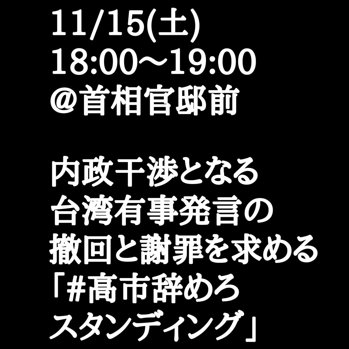 急ですが!あまりにもヤバい事態なので 11/15(土)18:00〜19:00 @首相官邸前 中国に対する内政干渉となる 台湾有事発言の 撤回と謝罪を求める 「#高市やめろ スタンディング」 やろうと思います。 集まれる方は一緒に立ちましょう! #戦争あおるな高市早苗 #SanaeTakaichi #FarRightTakaichi
