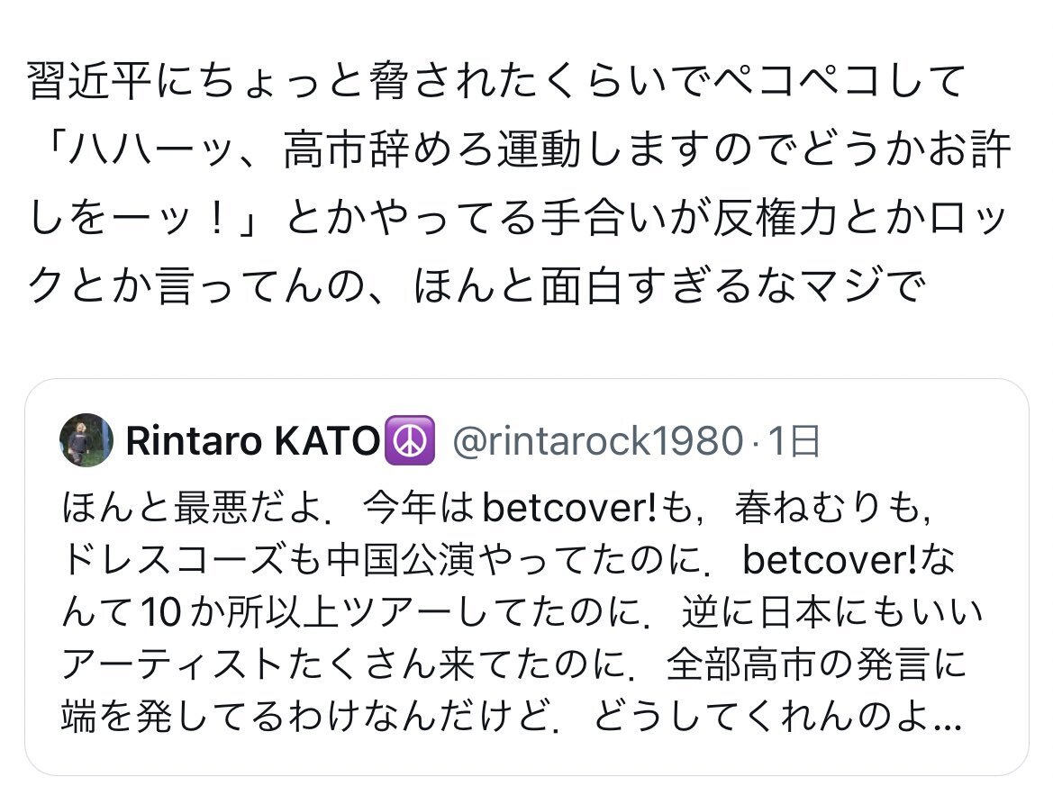 国の軋轢はあれど一般市民は音楽イベントを通して仲良く交流してたのに高市早苗なにしてくれとんねんっていうだけの話を何がどうしたら習近平に「ハハーッ、高市辞めろ運動しますのでどうかお許しをーッ!」とかやってることに変換されるのかマジでわからない