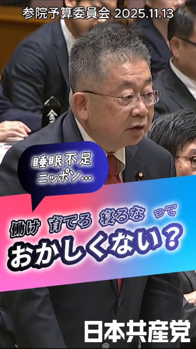 女性が働くのが当たり前になったこの社会。 今、日本の女性たちは—— “睡眠を削って” 毎日をなんとかやりくりしています。 #小池晃 書記局長は、参院予算委員会で問いかけました。 このうえ労働時間まで延ばして、いったいこれ以上何を求めるのか。 本当に必要なのは、 賃上げと “自由な時間”