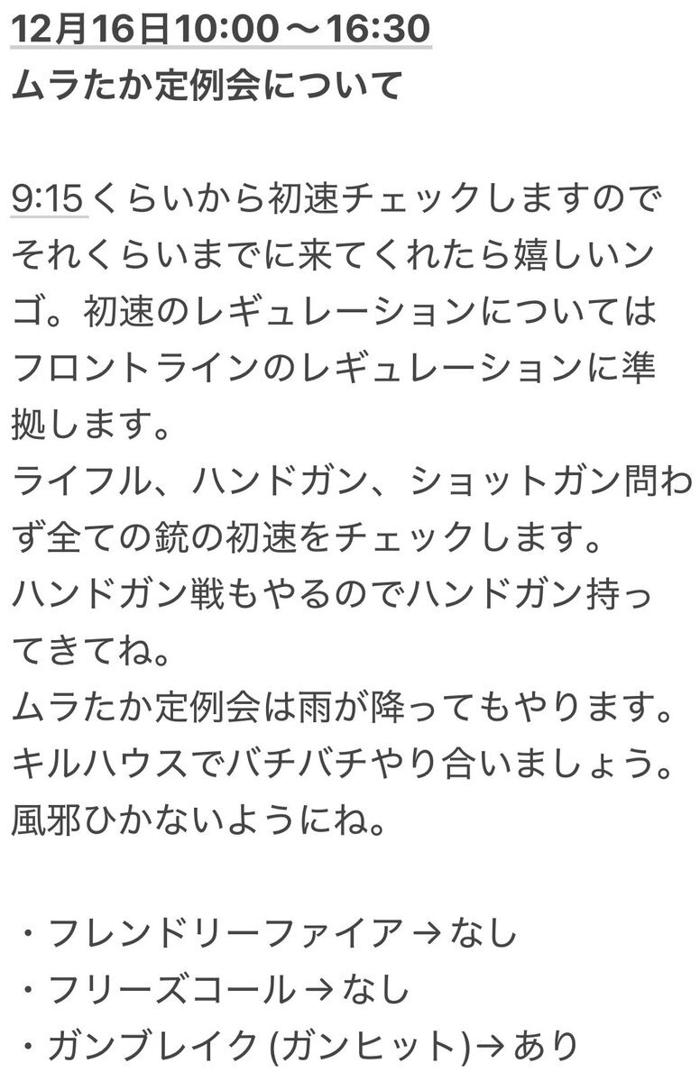 12月16日10:00〜16:30 ムラたか定例会開催! また無限復活戦しかしません!難しいルールのゲームしません!ハンドガン戦するかも! お昼の賄い有り!お楽しみに! #サバゲーマーさんと繋がりたい #ムラたか定例会 #命軽め祭り #賄い有り #愛媛フロントライン pic.x.com/hYLh12ZqK5
