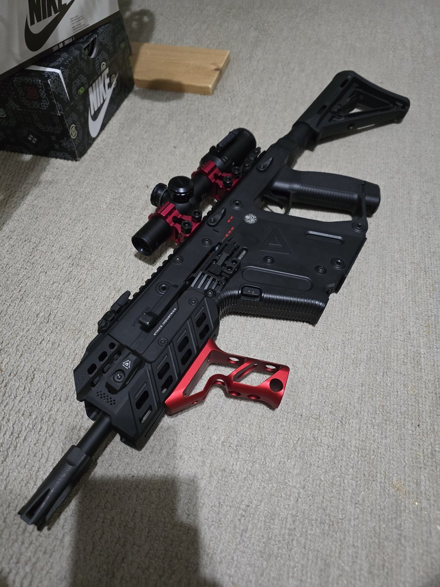 ベクターのカスタムパーツ組み込み終わった~✨ ストックをマグプルの形と色を変えて、ショートスコープのマウントを赤に変えて実パとゲーミング感を出してみました🎵 #エアガン #サバゲー #サバゲーマーさんと繋がりたい #ベクター pic.x.com/aVNv0LpChP