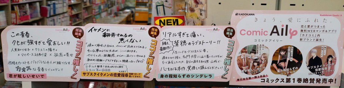 ✨新創刊( * ॑꒳ ॑* )✨ 恋と愛が詰まった無料Webマンガ&アプリ【カドコミ】内 新ブランド #コミックAilyコミックアイリー 誕生!! 第一弾は…… #身の程知らずのシンデレラ #サブスクイケメンの恋愛指導 #君が眩しいせいで ご来店、お待ちしております(。ᵕᴗᵕ。) #知恵蔵書店 #KADOKAWA pic.x.com/l4C9fHOFyu