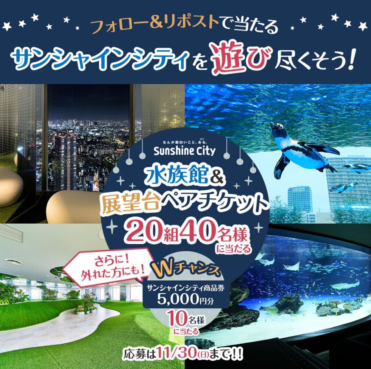 \🐧今年最後のキャンペーン🎁/ サンシャインシティ「水族館&展望台ペアチケット」を抽選で【20組40名様】にプレゼントします✨ ぜひ、応募してサンシャインシティを遊びつくそう! 外れた方にもWチャンスがあるよ👀 ▼応募方法📢 1️⃣@SunshineCity_PRをフォロー 2️⃣この投稿をリポスト