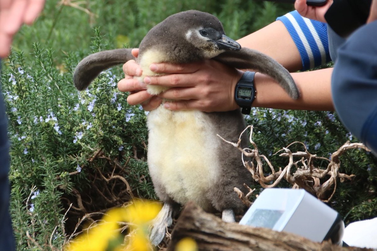 ケープペンギンの赤ちゃん🐧 11/18 身体測定してました😃2385〜2390g位??生後1ヶ月ちょいの時点のぽてとより随分大きいかも。動き回るスーパーもふもふちゃんの名前投票は11/21から #サンシャイン水族館 #子ペンギン2025 pic.x.com/QIAZUUTnhM