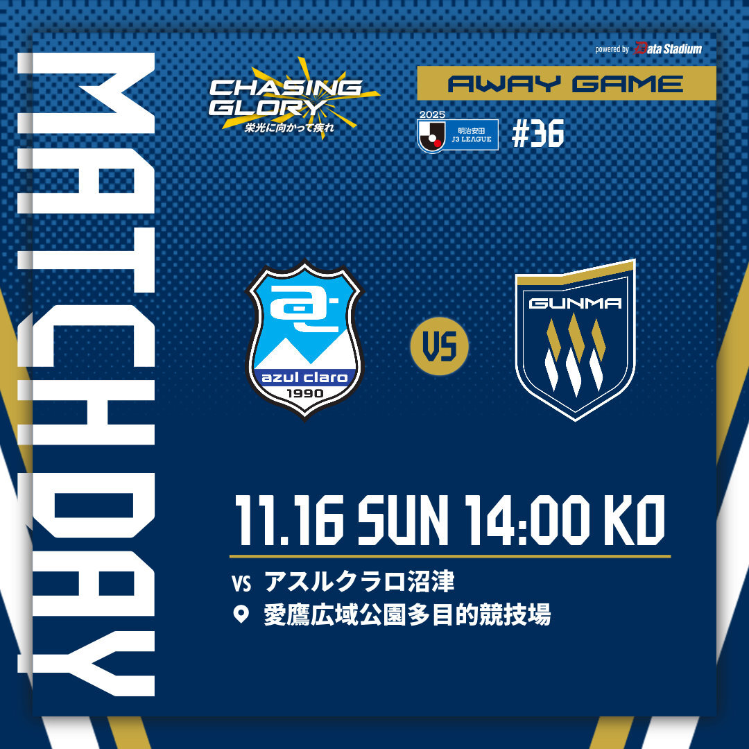 本日はマッチデー! 🏆明治安田J3リーグ 第36節 🆚#アスルクラロ沼津 🗓 11/16(日) 14:00キックオフ 🏟#愛鷹広域公園多目的競技場 応援よろしくお願いします🔥 #ザスパ群馬 #thespa #ChasingGlory
