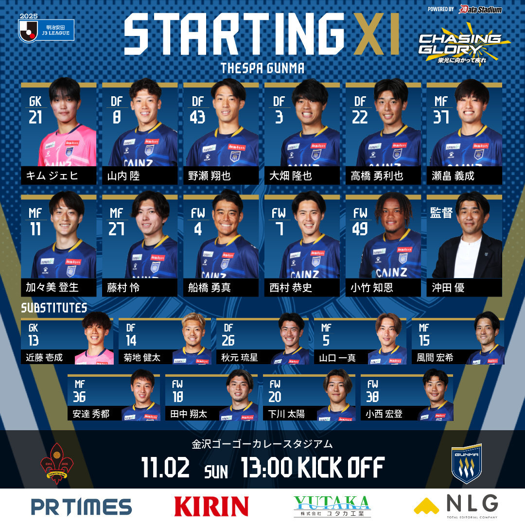 【明治安田J3リーグ 第34節】 #ツエーゲン金沢 🆚 #ザスパ群馬 ⏰13:00KO 🏟#ゴースタ / スタメン発表📢 \ 本日のスターティングメンバーが発表となりました🔥 熱い応援をよろしくお願いします‼ 🔵#DAZN 加入はこちらから ➡rcv.ixd.dmm.com/api/surl?urid=… #thespa #ChasingGlory