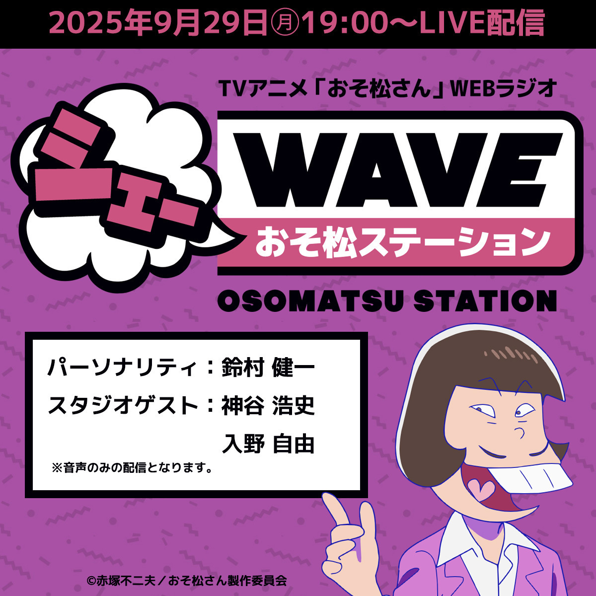 \ 🎧 #シェーWAVE 生配信決定✨️ / TVアニメ「おそ松さん」第4期最終回の放送を記念して、シェーWAVEの生配信が決定いたしました📻️ 「シェーWAVE おそ松ステーション」 📆日時:9/29(月)19:00~ 🎤MC: #鈴村健一 🎤スタジオゲスト:#神谷浩史 #入野自由 📱配信URL: youtube.com/live/hOeuWCf71… pic.x.com/IdbAfo6ppC