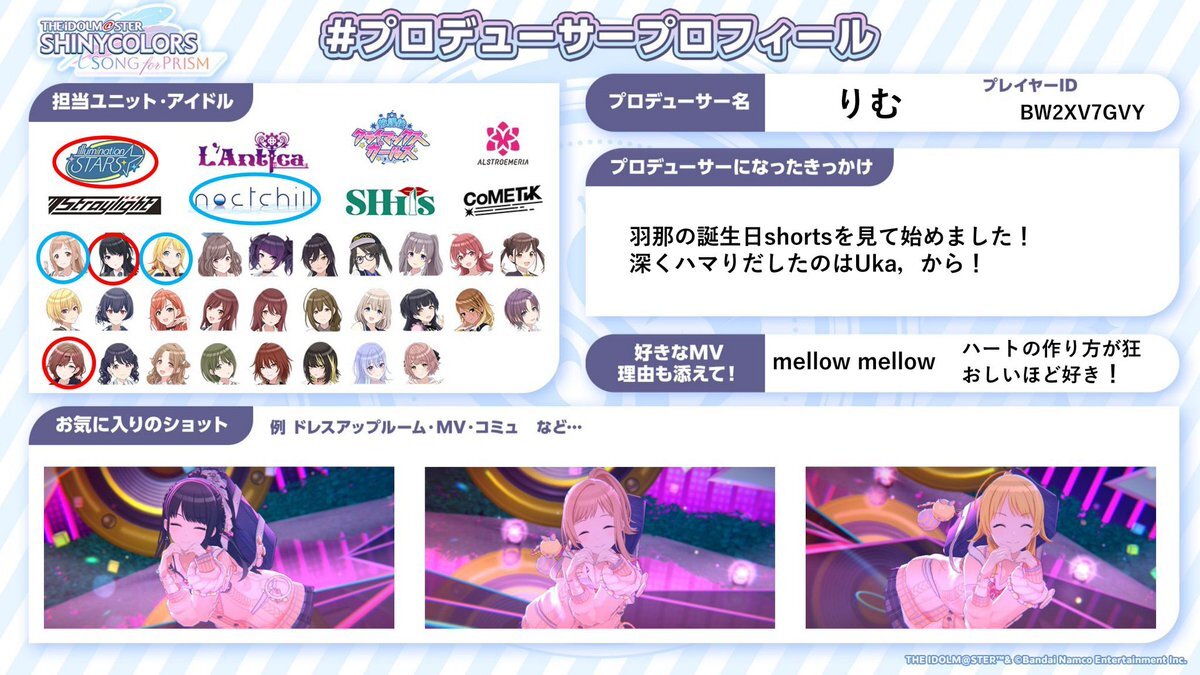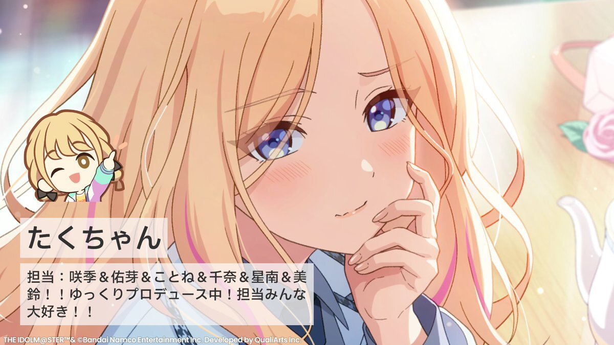 前垢消しちゃったけど螺旋参戦前にやっぱり!と思って作り直しです🙇♂️ 結華担当アンティーカPです! でも283のみんな大好き(*´﹀`*)♡ よかったら気軽に絡んでください🫶🏻 ♡.RTフォローさせていただきます🌸 #シャニマスPと繋がりたい #シャニマスPさんと繋がりたい #プロデューサープロフィール pic.x.com/Qo7cx3fyow