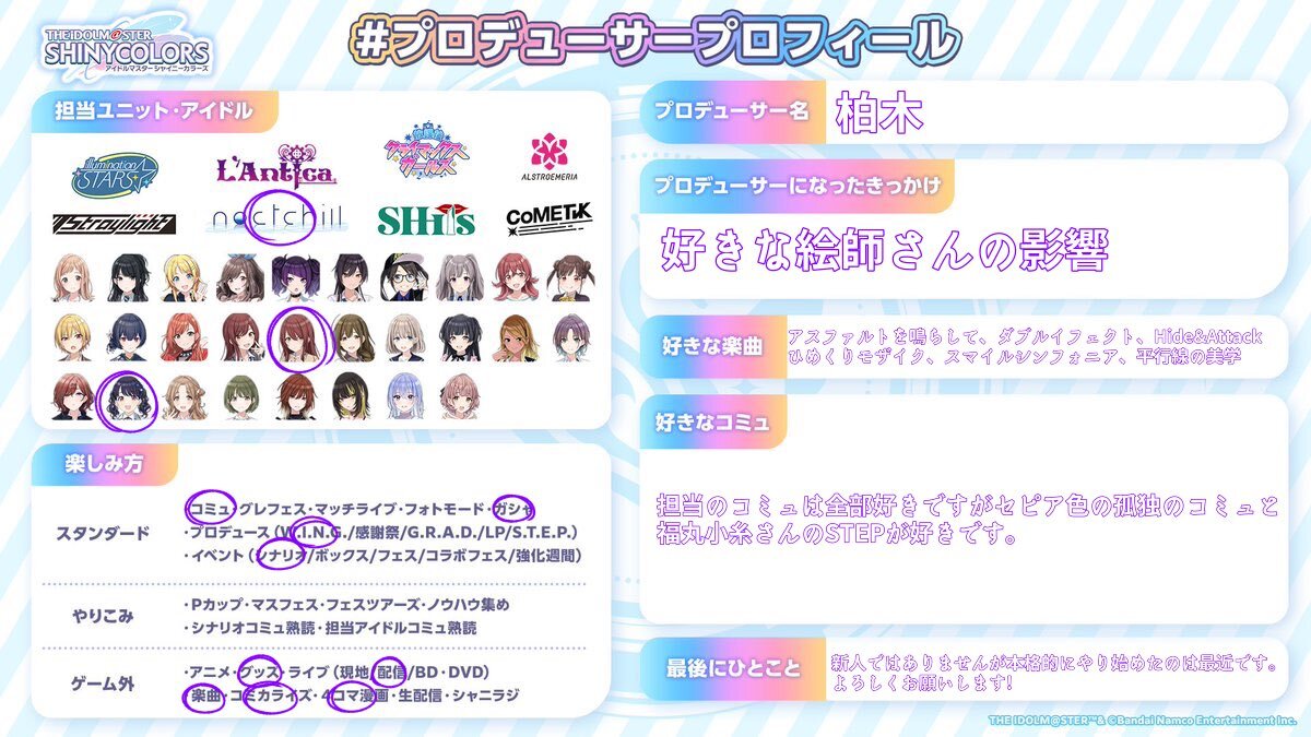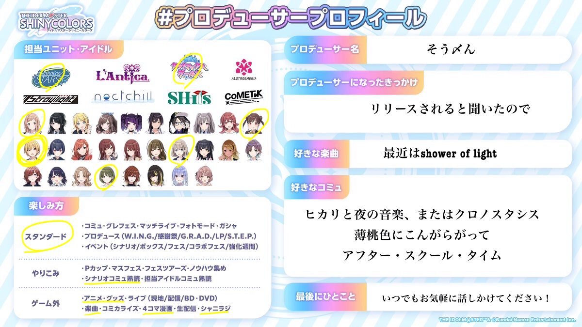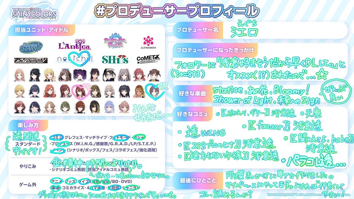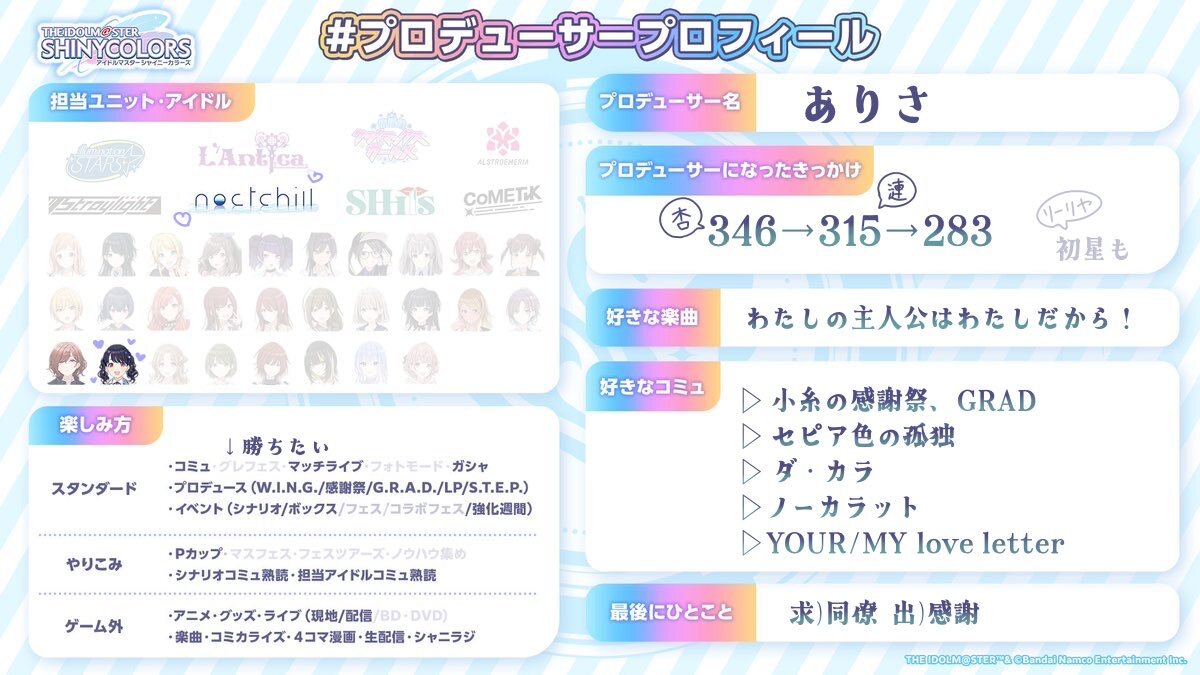 🔗先によろしければ反応・拡散お願いします💠 #シャニマスPさんと繋がりたい #シャニマスPと繋がりたい #プロデューサープロフィール x.com/50d0d0_/status…