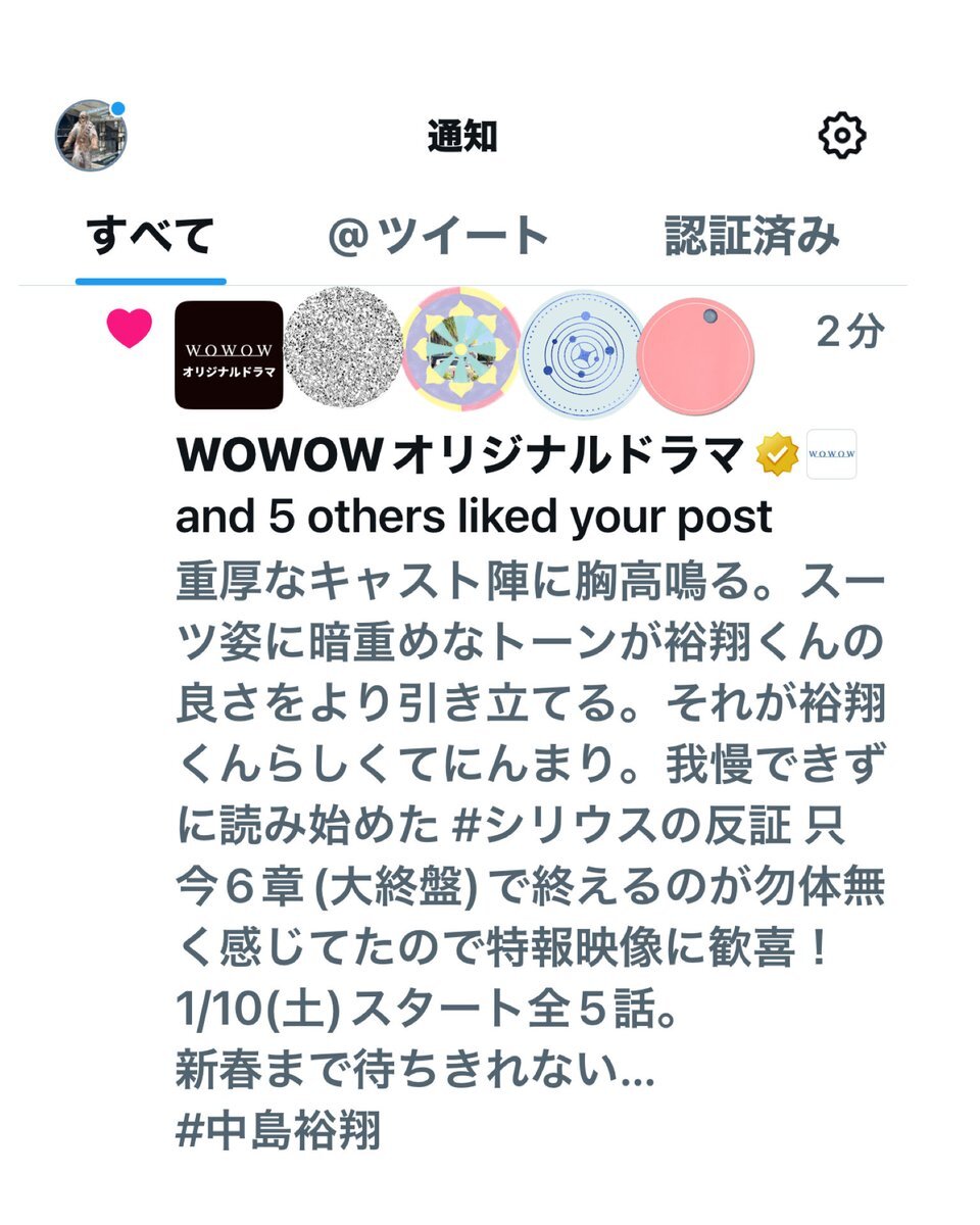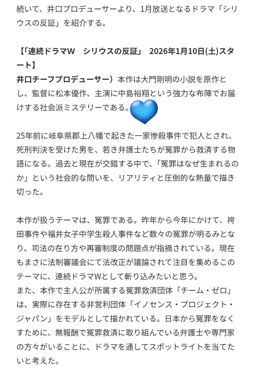 #シリウスの反証 2026年1/10スタートなのね! ドラマ秘密は2025年1/20スタートだったけど、毎年1月から裕翔くんの主演ドラマが始まるの、幸せすぎる✨ #中島裕翔 #WOWOW x.com/drama_wowow/st…