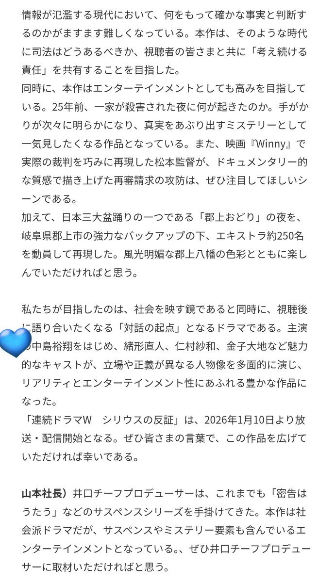 主演に中島裕翔という強力な布陣…に言っていただけて嬉しいな✨えん罪について描かれて…視聴後に語り合いたくなる対話の起点となるドラマ…など、この作品を伝えたいと言う熱き思いが🥹 corporate.wowow.co.jp/news/info/6765… #シリウスの反証 #中島裕翔 #WOWOW