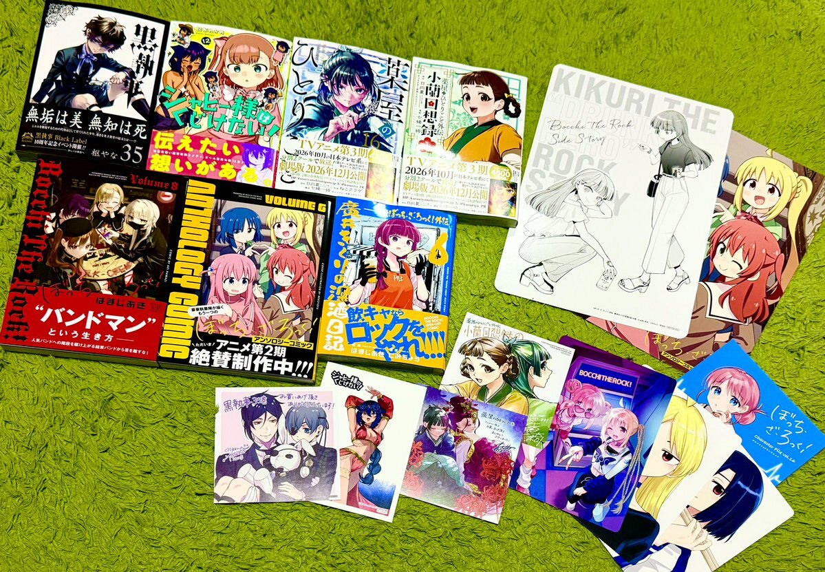 #今日買った漫画 #黒執事 35 #ジャヒー様はくじけない 12 #薬屋のひとりごと 16 ,外伝 #小蘭回想録 1 #ぼっち・ざ・ろっく 8 ,アンソロジー 6 ,外伝 #廣井きくりの深酒日記 6 pic.x.com/Q0GJHODtBB