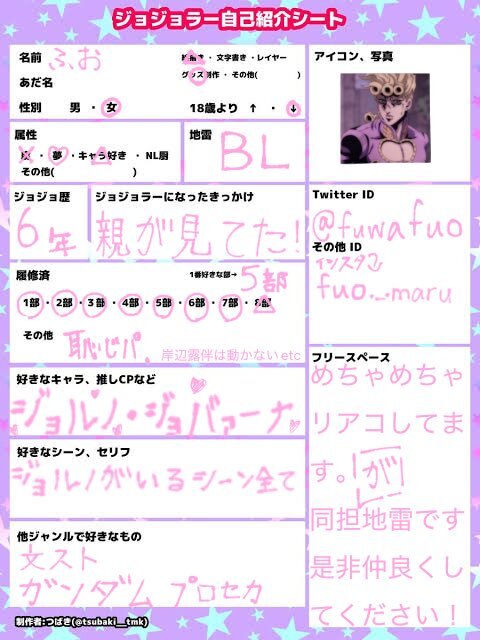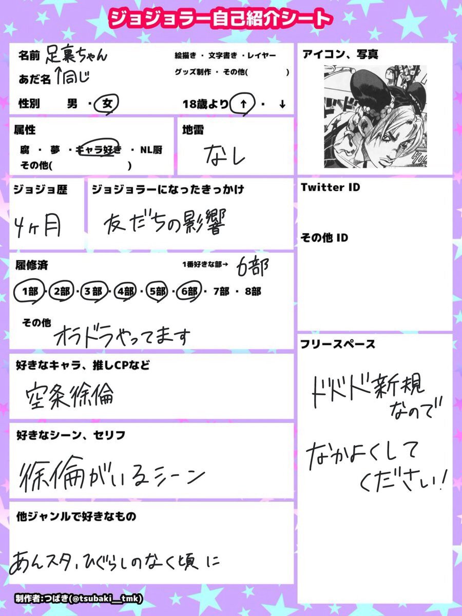 ドドド新規ですがお友達たくさんください🎵 徐倫が好きですꧦ𐅁𐀸𐋠𛰙᭜𖫴𖫰𖫱𖫳𖫲𖫲𖫳𖫴𖫰𖫱꛰ﯩᩝ︪᭜𖫴𖫰𖫱𖫳𖫲𖫲𖫳𖫴𖫰𖫱꛰ީᩝ𛰚っ ≡ ♡ #ジョジョラー自己紹介シート #ジョジョラーさんと繋がりたい #ジョジョ夢女子さんと繋がりたい #夢jo子さんと繋がりたい pic.x.com/uFpbnIfBiC