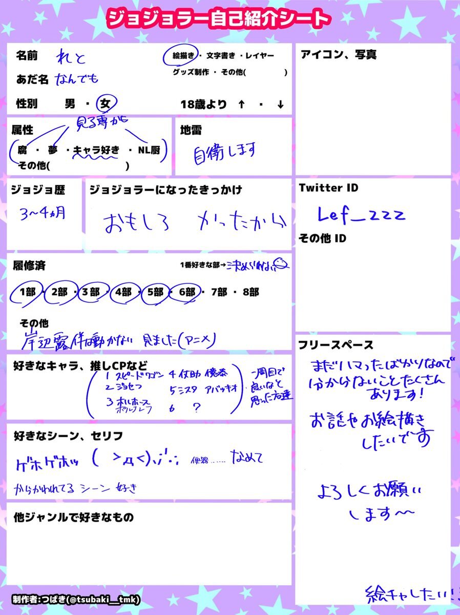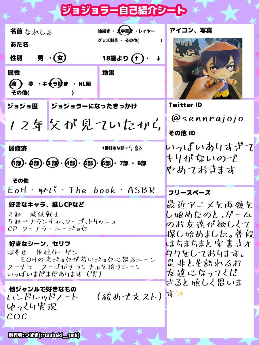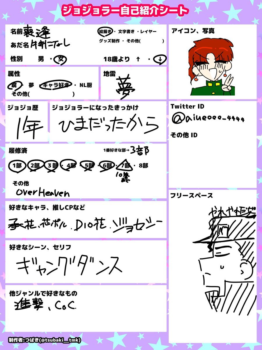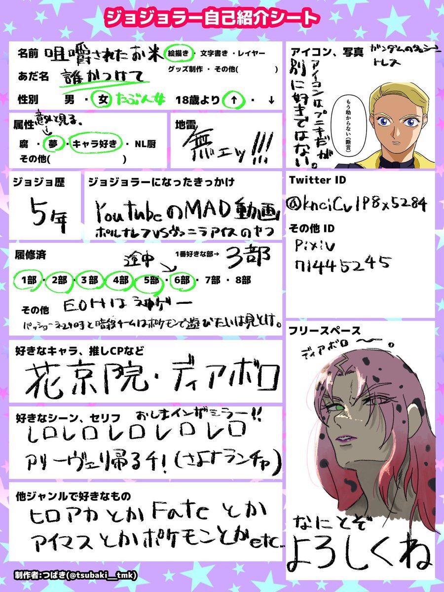 描きました よければ絡んでくださると嬉しいです アイコンじゃないのは勘弁してクダサイ…… #ジョジョラー自己紹介シート #ジョジョ好きさんと繋がりたい pic.x.com/EEvZZHzPpS