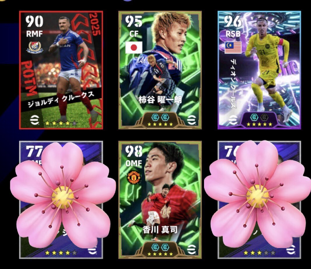いま登場してるセレッソ所属経験のある4選手ゲトりました‼️🐺🌸 #柿谷曜一朗 #香川真司 #ディオン・クルーズ #ジョルディ・クルークス #イーフト #efootball pic.x.com/dCzuNx8oE3
