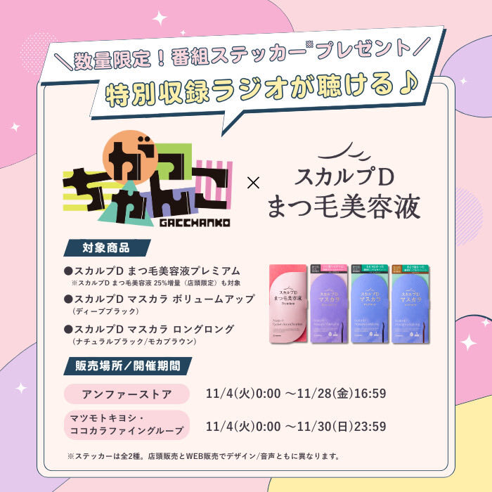 【#アンファー×#がっちゃんこ】コラボキャンペーン開催決定✨ 「スカルプDまつ毛美容液」など対象商品を買うと ここだけの"特別ながっちゃんこ"が聴ける 限定ステッカーをもれなくプレゼント! ▼キャンペーン詳細はこちら scalpd-eye.angfa-store.jp/news/post-3848 #スカルプDまつ毛美容液 #ABCラジオ