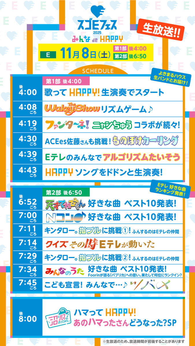 あす11/8(土)は… 💛🩵 #スゴEフェス 2025 みんな de HAPPY!🩵💛 第1部16:00~ 第2部18:50~ Eテレの名曲を生放送でたっぷりお届け! #Foorin #パプリカ は何位にランクイン? #佐藤龍我 さん(#ACEes)ものぼけに挑戦! タイムテーブルはこちら⬇ #スゴE #Eテレ