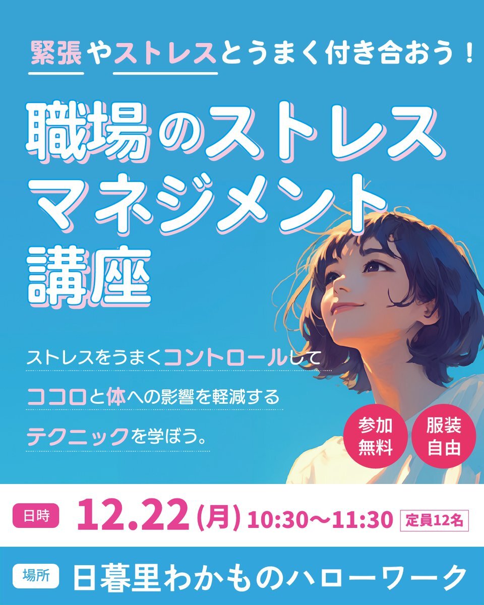 職場で感じる“なんとなく疲れる”あの感覚。 ストレスとうまく付き合う方法学んでみませんか? 📍12/22(月)10:30〜(34歳以下対象) ▶日暮里わかものハローワーク ▶参加無料/服装自由 🔗tokyowakamono2025.mhlw.go.jp/freeter/ #ストレスマネジメント #若者支援 #日暮里わかものハローワーク #無料講座 pic.x.com/iyp9FzhCEi
