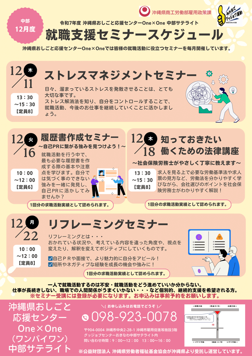 沖縄県おしごと応援センターOne×Oneです! / 中部サテライトで12月開催🎅🎄 \ 就職活動に役立つセミナーが盛りだくさん! ※セミナー参加には事前登録が必要です。 お電話でお問い合わせください! #沖縄 #就職 #スキルアップ #履歴書作成セミナー #ストレスマネジメント #法律講座 pic.x.com/CIhi4jl2Bg