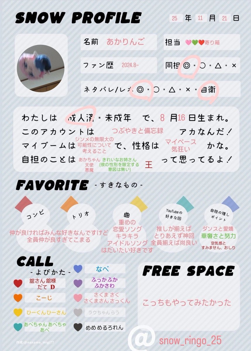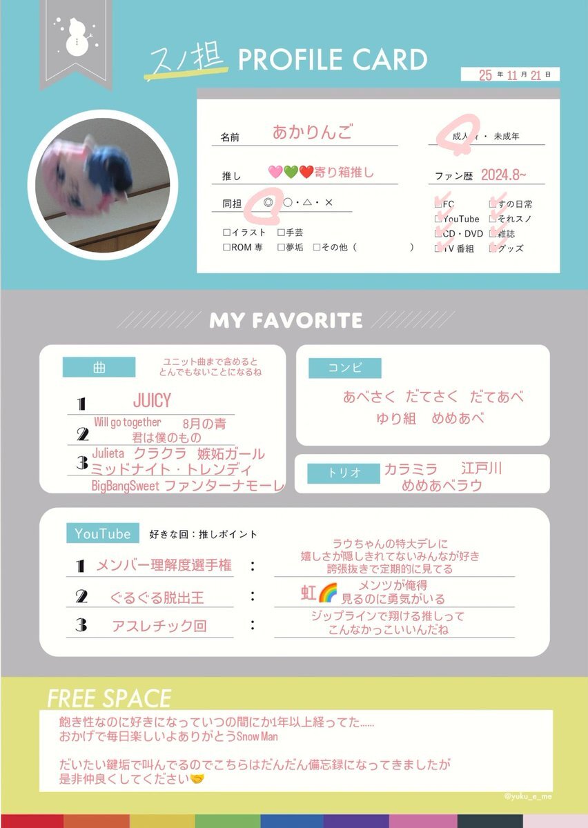 前回のプロフから一年経ったので新しくしました🙌 お借りしました 固定用です よろしくお願いします🙇♀️ #スノ担プロフカード #スノプロフ書いたよ #スノ担さんと繋がりたい pic.x.com/gnyUDyhrgP