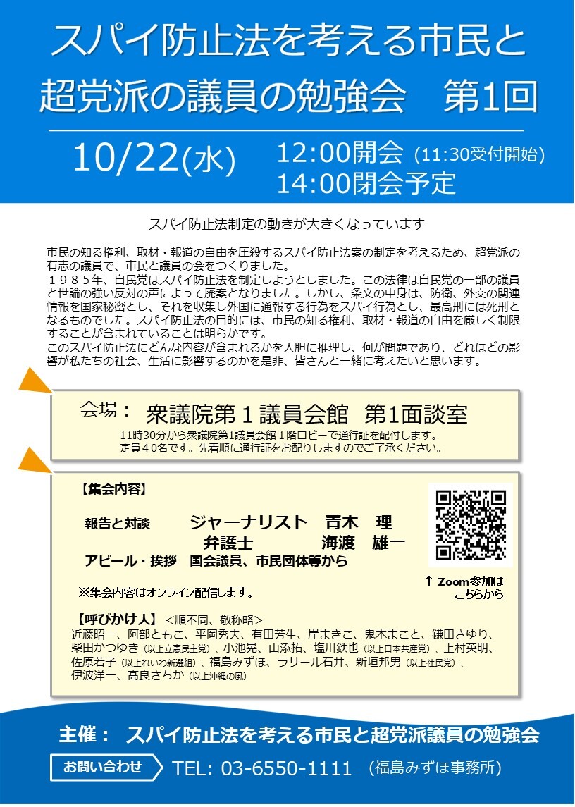 「スパイを防止するなんて当然じゃないか!」と思っている皆さん。実はこれ、私たちにもとっても大きな問題になり得ます。これまで通り普通に生活しているだけなのに、さまざまなことが制限され、自由が奪われる可能性があるのです。 今日のお昼からです!超党派の国会議員も参加する #スパイ防止法