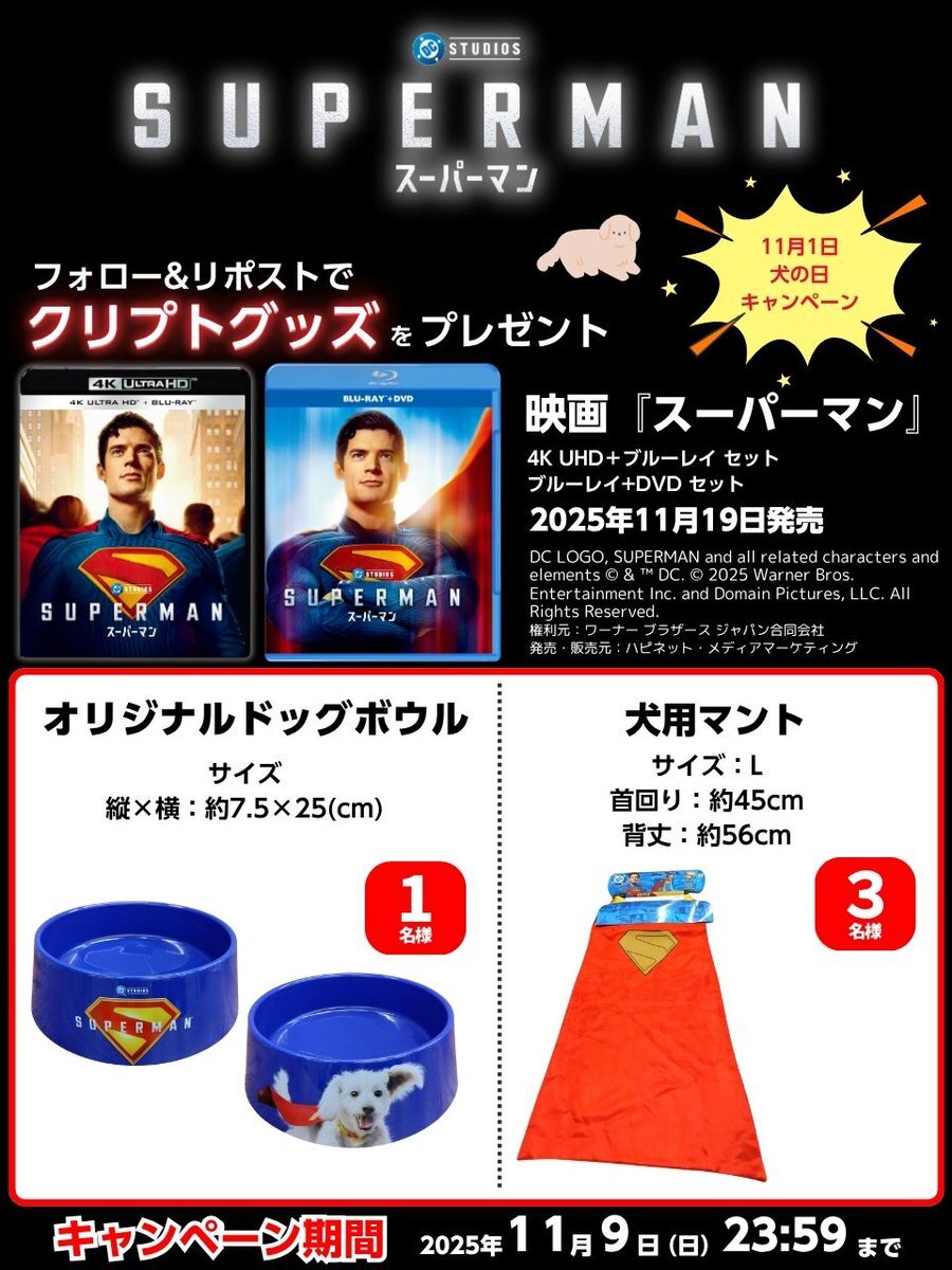 4K UHD&ブルーレイ&DVD 11/19発売 映画『スーパーマン』 🐶#犬の日🐶キャンペーン開催! フォロー&リポストで クリプトグッズを 計4名様にプレゼント🎁 ■応募方法 1. @happinet_lab をフォロー 2. この投稿をリポスト ※当選者にDM 応募締切:2025/11/9(日)23:59 #DC #スーパーマン