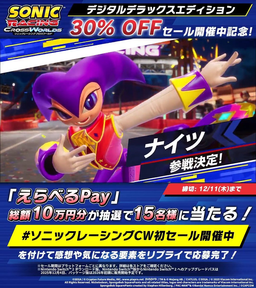 『ソニックレーシング クロスワールド』 🗨️初セール開催中記念キャンペーン! 「えらべるPay」総額10万円分が当たる✨ (1万円分×5名様、5000円分×10名様) ➕ゲーム写真/動画付き応募で 1名様に缶バッチ全14種セットをプレゼント🎁 《応募方法》 フォロー& #ソニックレーシングCW初セール開催中