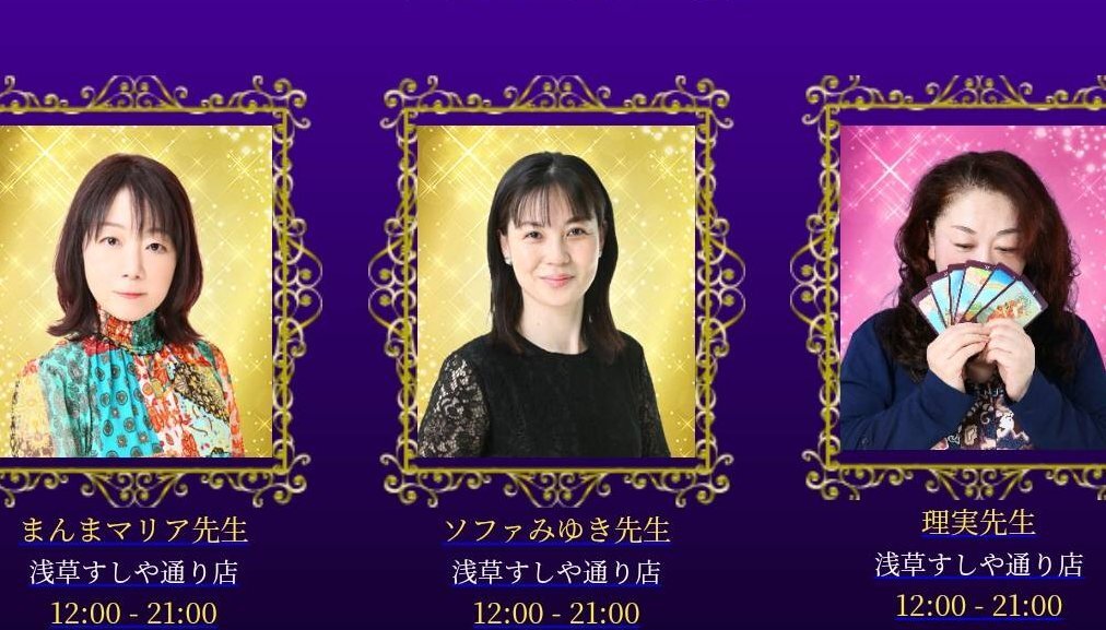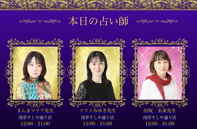手相や運勢。恋愛や仕事占い!雷門通りから30秒。国際通りからも近いすしや通りにある占い館。ハートフル浅草すしや通り店 本日10月26日(日)の占い師はこちら💁‍♀️ 🌸まんまマリア先生 🌸ソファみゆき先生 🌸理実先生 ☎️ 03-6231-6637 #浅草占い #占い当たる #浅草