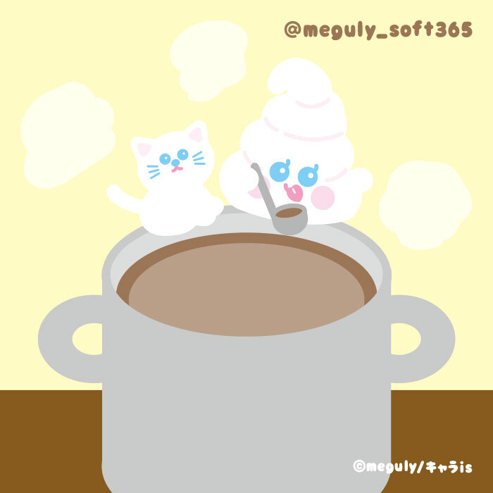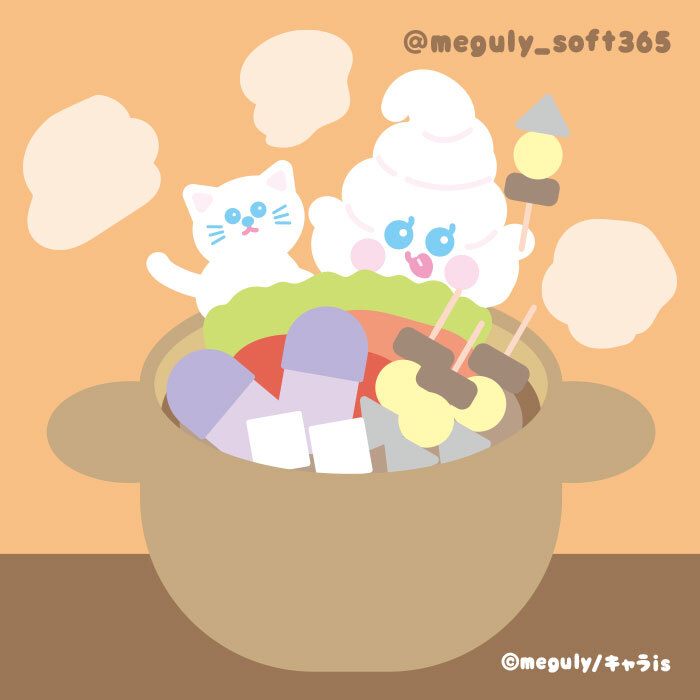 今日は #鍋の日🍲 りぼんぱ~ら~のおみせのキッチンで ぽかぽかになるお鍋を つくっている ソフトクリームのあたまくんたち🍦🐈 スリッパは 中に入れないでね👀 #今日は何の日 #イラスト #illustration #りぼんぱ~ら~のファンシーイラスト #ソフトクリームのあたまくん #キャラis
