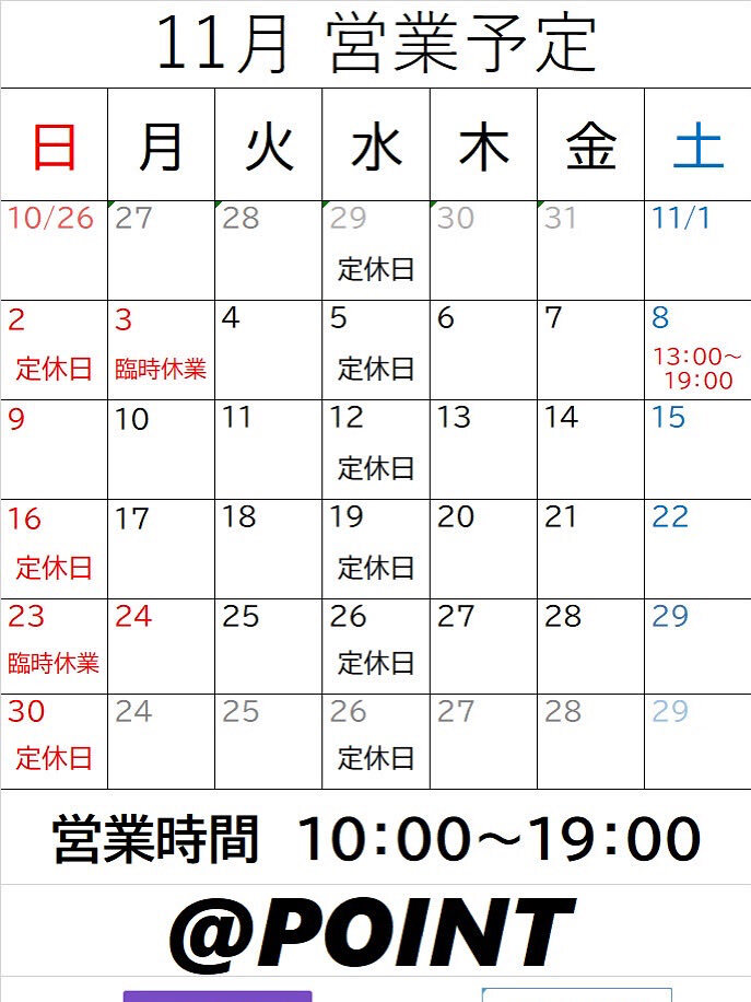 【お知らせ】 11月の営業予定となります。 臨時休業などの予定がありますので、予定表をご確認ください。 #point_2728 #ソフトテニス好きな人と繋がりたい #ソフトテニス専門店 #那須塩原市 pic.x.com/6IJdjVx4y7