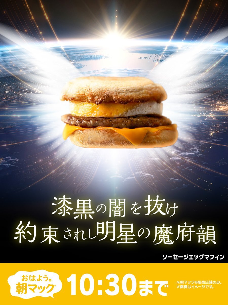 🌅朝からテンション上がるー!!✨ 「漆黒の闇を抜け 約束されし明星の魔府韻」って何この壮大さ🤣 ソーセージエッグマフィン、まるで伝説の朝ごはん☀️ 今日も頑張れそう💪💕 #朝マック #マクドナルド #ソーセージエッグマフィン x.com/mcdonaldsjapan…