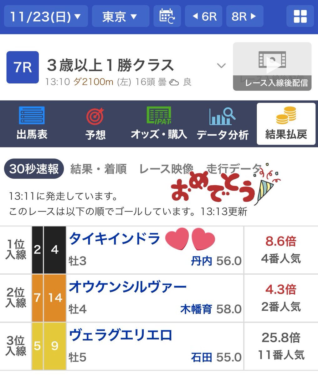 うおお!東京7Rで三連複の万馬券とった!グリーンチャンネルさんありがとう! グリーンチャンネルのパドック推奨馬どおりに三連複買ったらトータル勝ち越しになる説!! #東京7R #タイキインドラ #ヴェラグエリエロ #オウケンシルヴァー