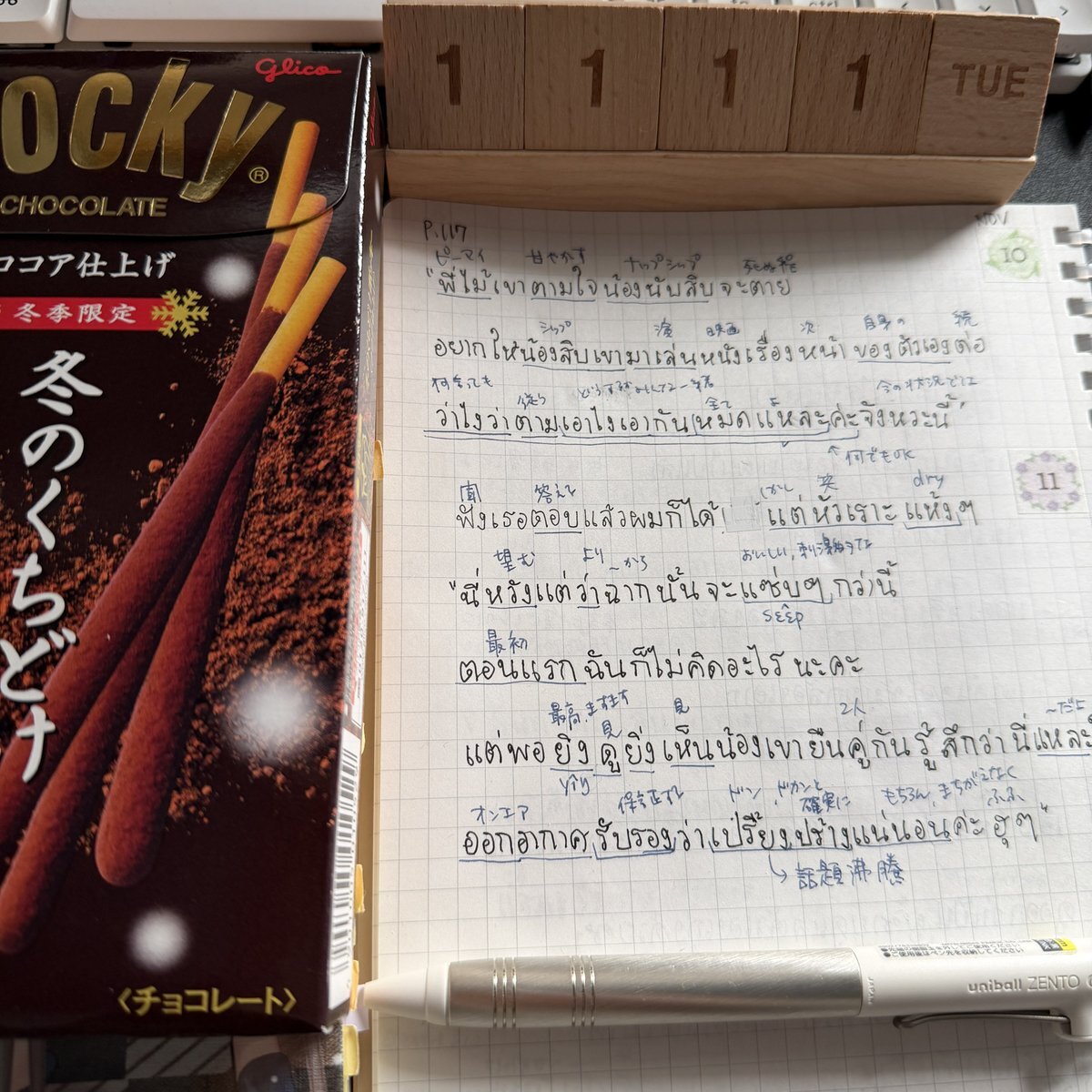 今朝の #lovelywriter写経 #lovelywriter #タイ文字部 今日はポッキーの日! ※日本語版155ページ ✍️ แซ่บๆ 辛くて美味しい→刺激的 เปรี้ยงปร้างどかんと、話題沸騰?? pic.x.com/friCHKTjGf