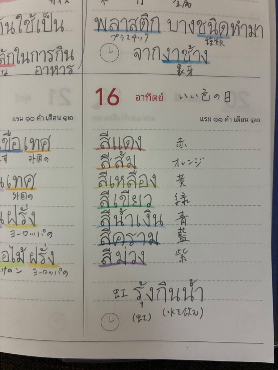 今日11月16日は #いい色の日 以前、🟤色を表す言葉が国によって色々で面白いなとポストしたことがありました。 「色々」は、平安時代の貴族文化である「襲の色目(かさねのいろめ)」に由来し、元々は衣服の配色美を表現する言葉だそうですね✨ #まいにちふれるタイ語手帳 #タイ文字部 pic.x.com/SewvroQCI2 x.com/miercoles12752…