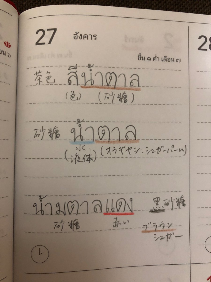 日本語の茶色🟤は、お茶を染料として使った時に出る色に由来するらしい。 タイ語では茶色=สีน้ำตาล(砂糖色) スペイン語では茶色=marrón(栗)🌰 ちなみに英語のbrownはbear(熊)🐻に由来するのだそう。 それぞれ違っていて面白い! #まいにちふれるタイ語手帳 #タイ文字部
