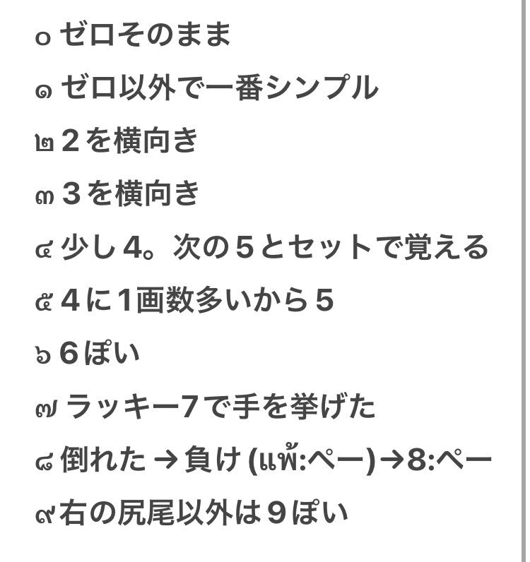 書くなどして正攻法で覚えた方が絶対良いと思いますが、長文問題にタイ数字が出る(数値の時刻が、問題文の選択肢では「夕方」などと言い換えられてた) と知り先月10月、試験まで残り1-2週間で覚えました タイ数字覚え方の歌やサイト見つからなくて… #タイ語 #タイ文字部 #タイ語検定 pic.x.com/POX7uJn4Mo