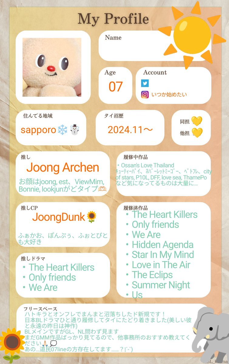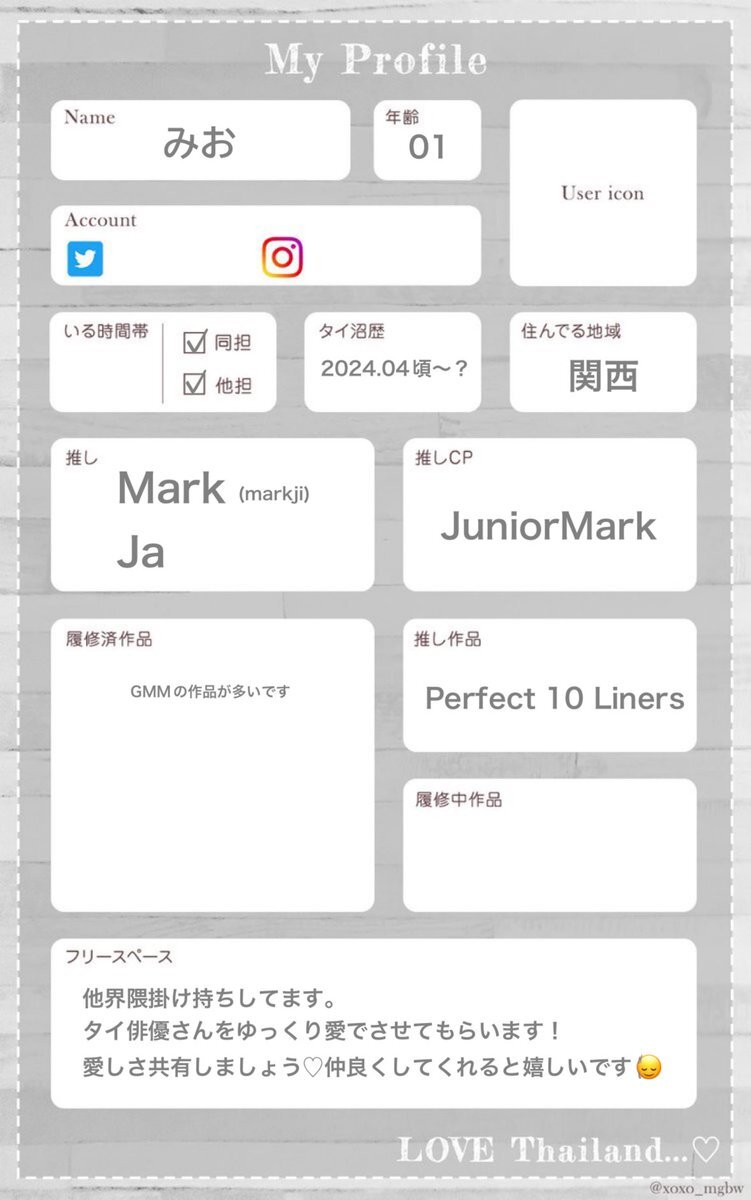 タイ沼超初心者です🇹🇭🔰 ぜひ仲良くしてください!! GMMを中心にマイペースにオタクしています❤️‍🔥 #タイ沼さんと繋がりたい #タイ沼自己紹介シート pic.x.com/wQvWzQGagz