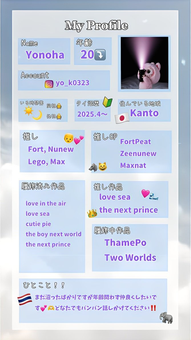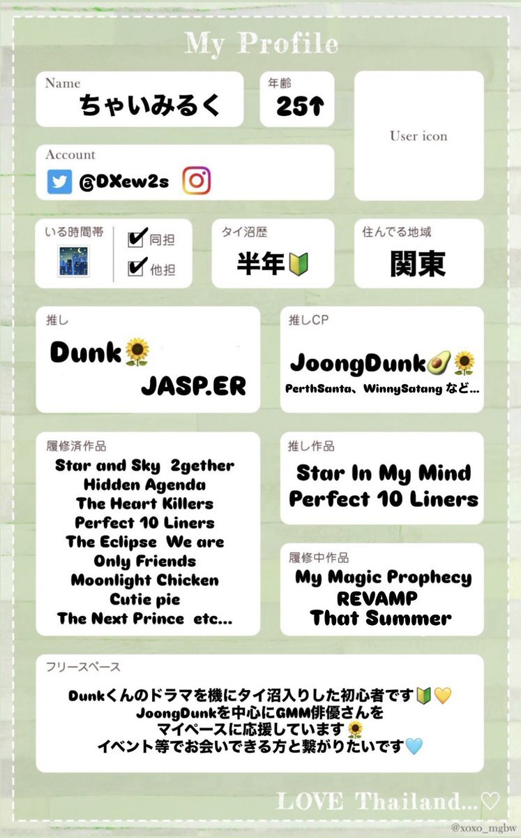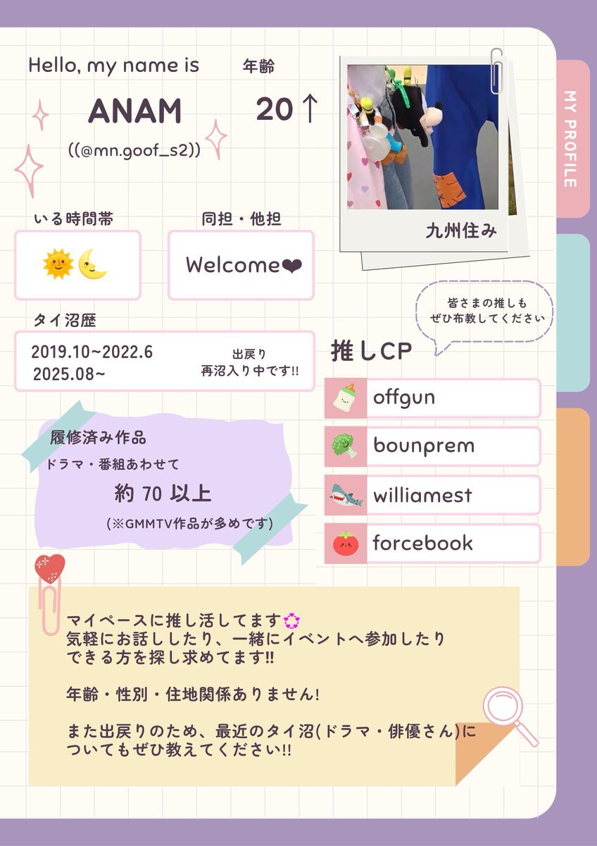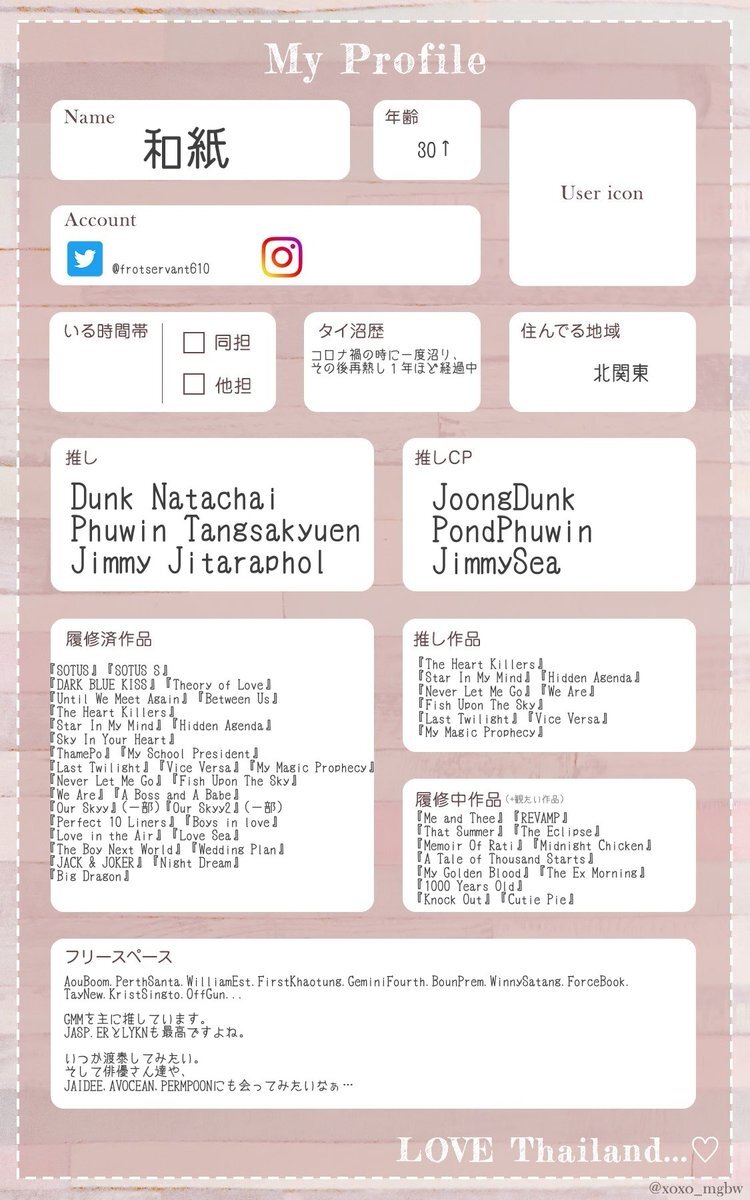 🏷️⟡.· ♡or↺で気になった方お迎えさせていただきます♩♥ #タイ沼プロフィール #タイ沼自己紹介シート #タイ沼さんと繋がりたい #タイBL好きな人と繋がりたい
