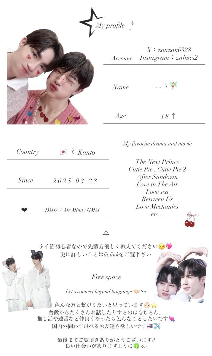 @0 🔗先に反応お願いしますᐡᴗ͈ ·̫ ᴗ͈ 事務所、年齢関係なく仲良くしたいです♡ #タイ沼プロフィール #タイ沼自己紹介シート #タイ沼さんと繋がりたい #タイBL好きな人と繋がりたい x.com/s2__knp/status…