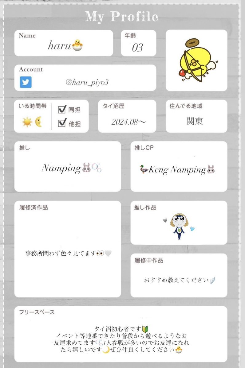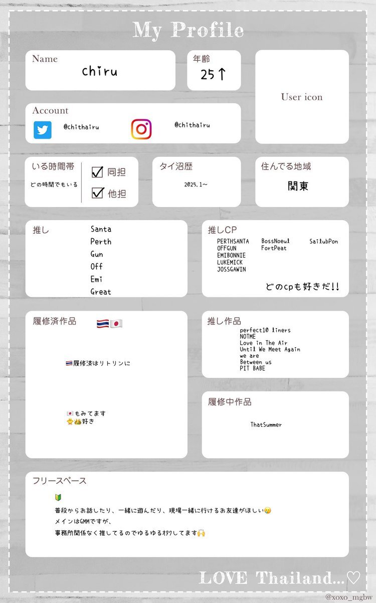 new🏷️ 沢山の方と繋がりたいです^ᴗ.ᴗ^♡ 🔁or♡で気になった方お迎えさせていただきます🫶🏻 #タイ沼プロフィール #タイ沼自己紹介シート #タイ沼さんと繋がりたい #タイBL好きな人と繋がりたい