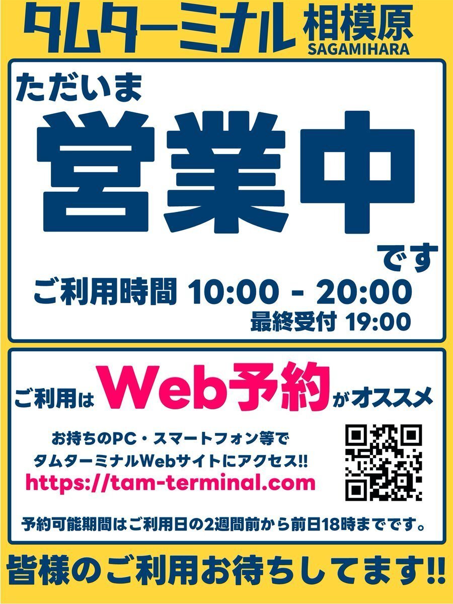 #タムターミナル相模原🚃🚃🚃 営業開始しました! 最終受付は19時となります。 <お知らせ> 明日以降のご利用にはWeb予約がオススメです! ※ご利用日の2週間前から前日18時までご予約可能です。 tam-terminal.com ご来店お待ちしてます! #タムタム相模原店 pic.x.com/xnp9MhtPEF
