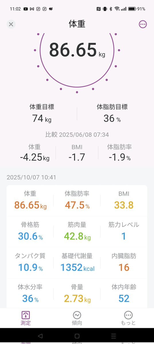 2025/10/7 (火) MAX比-4.25kg️⬇️ 86.65kg⬇️47.5%➡️️️BMI33.8⬇️️ 減ったーー!!やっと86kg台に戻せたーー!!🎉 でも明日は友だちとお出かけなのでまた増えるかも……。 #ダイエット記録 #ダイエット仲間募集中 #ダイエット垢さんとつながりたい pic.x.com/36y6kROgay