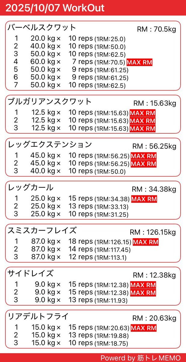 昨日のトレーニング忘れてました 脚と前日やらなかった肩の中部後部やりました💪 スクワットは無理に重量追うのやめて深くしっかり下ろすこと意識したらめちゃくちゃ効いてます✨ #筋トレMEMO #筋トレ垢と繋がりたい #ダイエット垢さんとつながりたい pic.x.com/31Rv1lFhRK