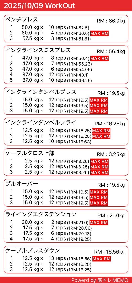 10/10(金) 運動 ベンチプレス 50kg 9回 8回 8回 アブロラ膝コロ 20回×3 ジョギング 36分 5.3km #ダイエット #ダイエット仲間募集中 #ダイエット垢さんとつながりたい
