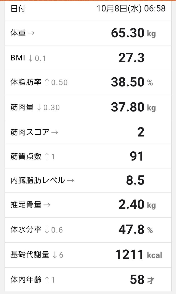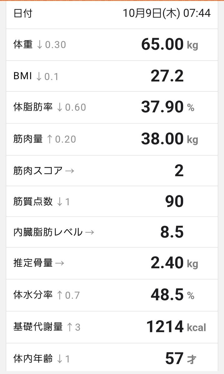 2025.10/9 体重 65.0kg(前日比-0.3kg) 体脂肪率 37.9%(前日比-0.6%) 内臓脂肪レベル 8.5 BMI 27.2 #ダイエット垢と繋がりたい pic.x.com/jGAJ8uTJL3